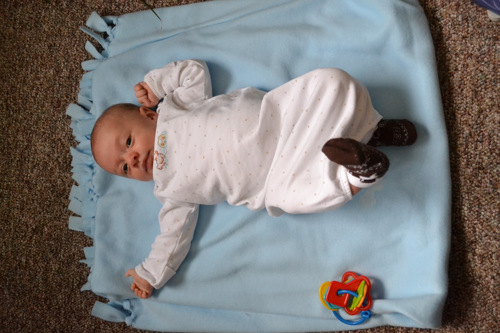 This little boy is full of funny faces and as of late he will smile when you try to get him to smile. It is so adorable. He also likes to lay in my arms with his feet facing me, head in my hands and he just turns his head back and forth with full rotation pausing for 3-5 seconds on each side. It is pretty cute. He is also getting really good at holding his head up by himself.
